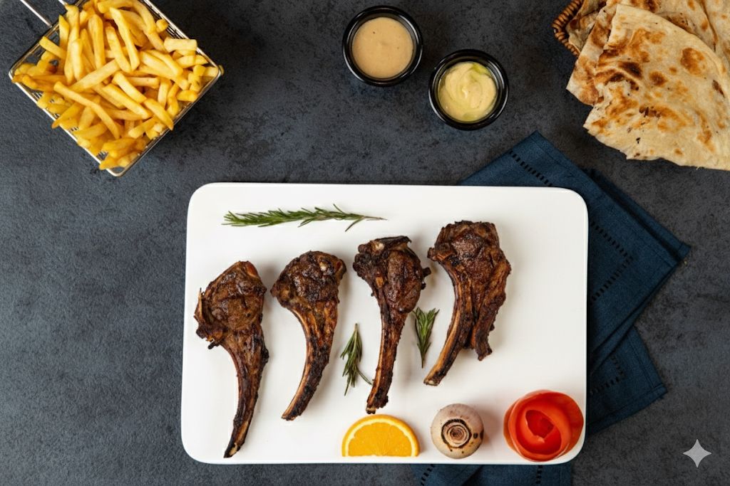 Mutton meat grilled over a traditional stone, uniquely barbecued with a smoky flavor, served with flavorful mandi rice, soup & variety of sauces & pickles.